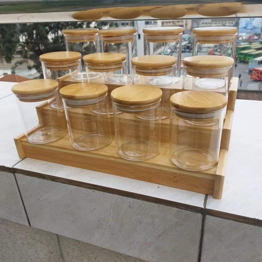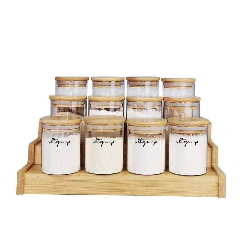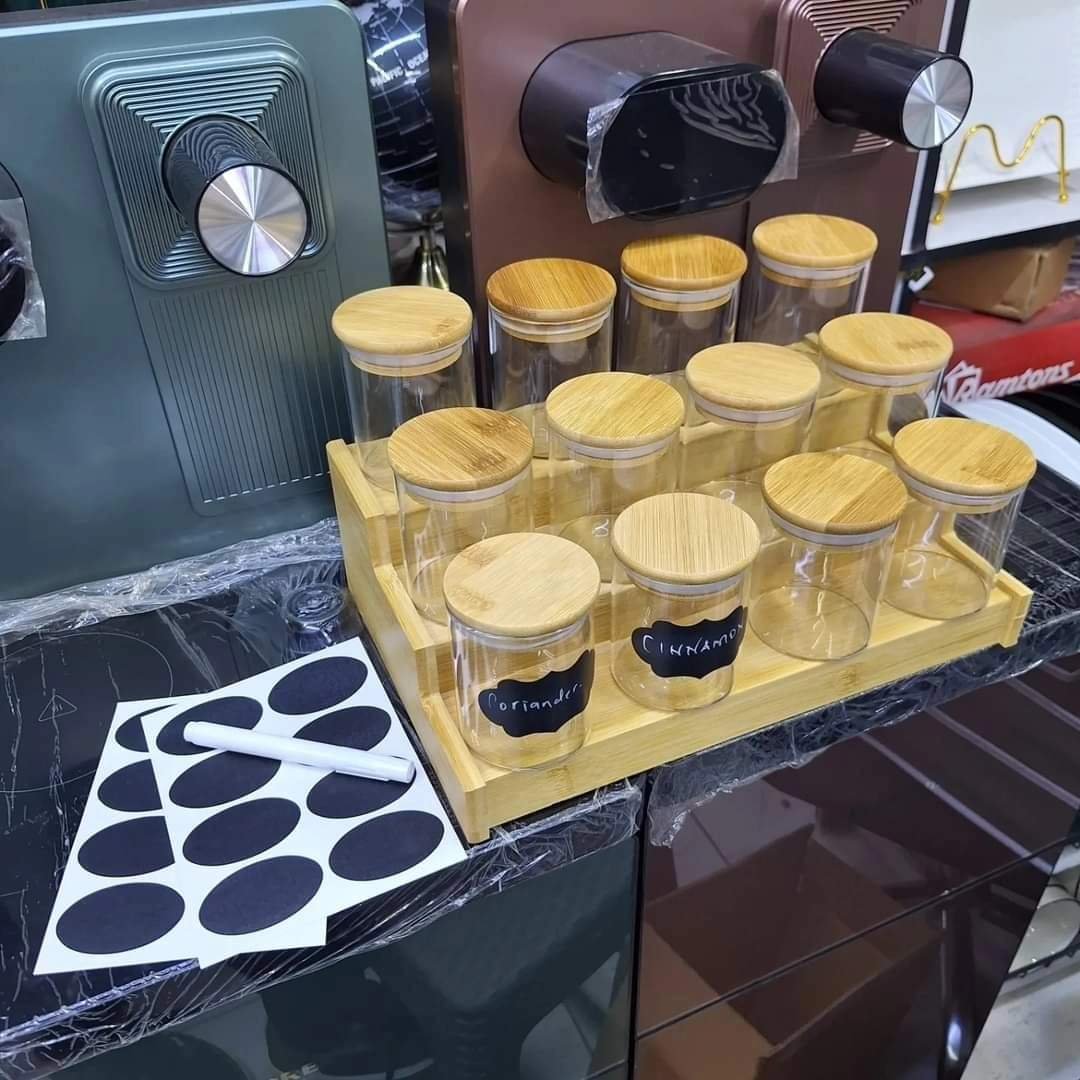 12pcs Glass Spice Jar set with a Wooden Bamboo Stand